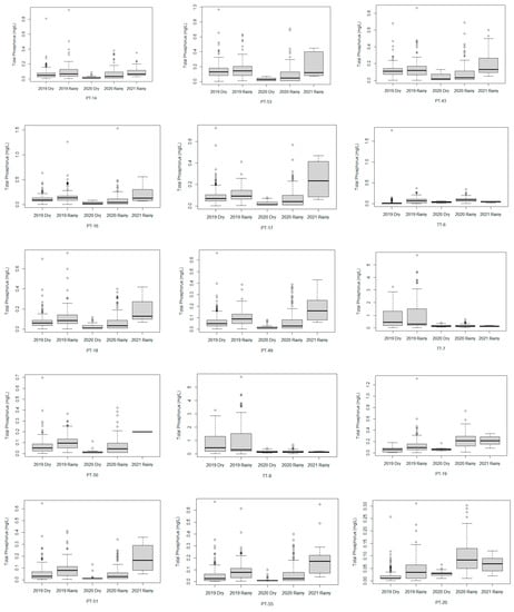 Box-plots of total phosphorus concentrations in stations located in the Paraopeba River (PT stations) or in the tributary streams (TT stations) farther than 55 km from the B1 tailings dam site: PT-14 (53.9 km); PT-53 (76.5 km); PT-43 (115.8 km); PT-16 (122.6 km); PT-17 (155.3 km); TT-06 (183.7 km); PT-18 (184.2 km); PT-49 (206.3 km); TT-07 (206.3 km); PT-50 (222 km); TT-08 (239.5 km); PT-19 (249.8 km); PT-51 (267 km); PT-55 (282 km); PT-20 (297.9 km); PT-28 (309 km); PT-21 (315 km); CE-01 (315.7 km); CE-02 (319.3 km); and PT-22 (341.6 km).