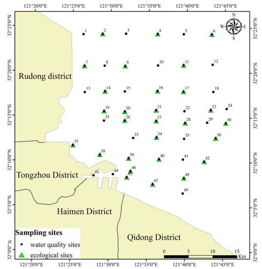Samples were collected from 47 water quality stations and 28 ecological stations in the coastal waters of Tongzhou Bay during September and November 2018 and during January and April 2019 such as (Figure 2). Water samples and benthic samples were collected using a WB-PM water sampler and a grab sampler, respectively. The depths at which the water quality samples were taken depended on the water depth at the station. When the water depth at the station exceeded 10 m, samples were taken at a depth of 1 m as well as at the bottom, with the average measurements across the two samples used in the present study. Only surface water samples were taken when the water depth was less than 10 m. Water sample temperature, salinity, and pH were measured using a thermometer, salinometer, and pH meter, respectively. Chemical oxygen demand (COD), dissolved oxygen (DO), dissolved inorganic phosphate (DIP), nitrite, nitrate, and ammonium were measured using the potassium iodide alkaline permanganate, iodometric, phosphomolybdenum blue spectrophotometric, naphthalene ethylenediamine spectrophotometric, zinccadmium reduction, and hypobromite oxidation methods, respectively. Nitrite, nitrate, and ammonium were added up to represent the dissolved inorganic nitrogen (DIN). All the methods above followed the sea water monitoring standard of China [20].