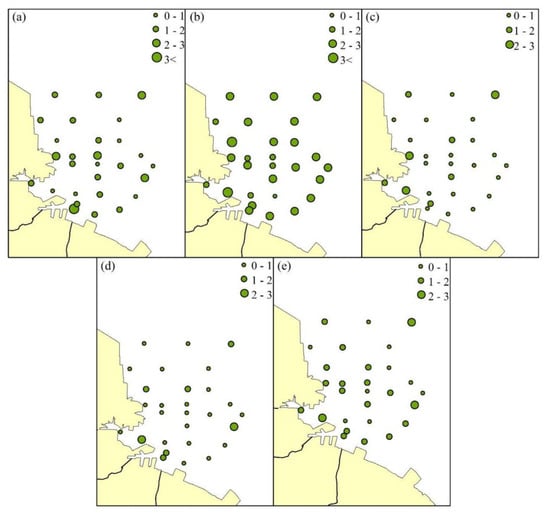 Spatial distribution of the values of the Shannon–Wiener index in Tongzhou Bay, Nantong City, Jiangsu Province, Eastern China. (a) September 2018; (b) November 2018; (c) January 2019; (d) March 2019; (e) mean value.