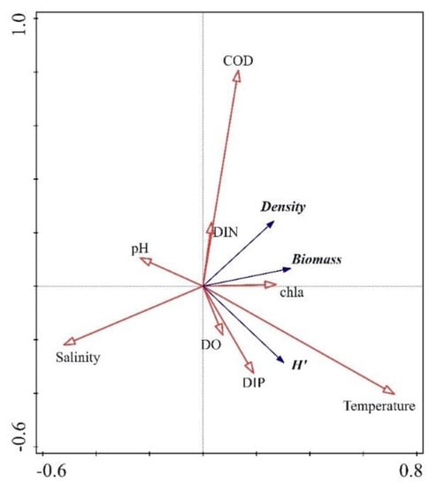 As according to the results of the DCA (log = 0.8), the RDA model was used to analyze the relationship between environmental factors and biological data. Figure 4 and Table 3 shows that the Shannon–Wiener index of benthic organisms was mainly positively affected by temperature and dissolved inorganic phosphorus (DIP). Pearson correlation analysis showed that the biodiversity of benthic fauna was positively correlated with temperature (p < 0.01, R = 0.323) and negatively correlated with COD (p < 0.05, R = −0.226).