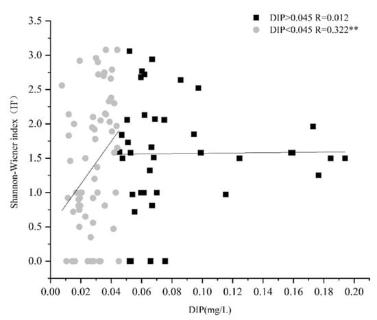 Correlation between dissolved inorganic phosphorus (DIP) and the Shannon–Wiener index for water samples from Tongzhou Bay, Nantong City, Jiangsu Province, Eastern China. ( **: p < 0.01).