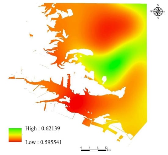 The benthic habitat suitability ranged between 0.59 and 0.62 with an average of 0.6, thereby indicating a medium habitat suitability. Figure 6 shows the spatial distribution of HSI in which the area situated far from shore, particularly in the central parts, showed high values, whereas low values were simultaneously concentrated in the nearshore and north area.
