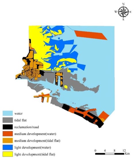 The proportion of developed area to undeveloped area was 48.54%, among which light development was mainly concentrated in the northern nearshore area, accounting for 20.84% of the study area (10.75% in the tidal flat and 10.09% in the water area). Medium development accounted for 10.04% (4.92% in the tidal flat and 5.12% in the water area) of the study area. Reclamation/road area did not possess habitat quality and showed the smallest proportion of the study area.