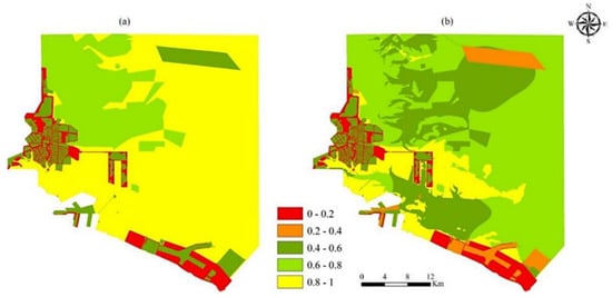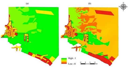 Spatial distribution of habitat quality of Tongzhou Bay, Nantong City, Jiangsu Province, Eastern China. (a) without HSI; (b) with HSI.