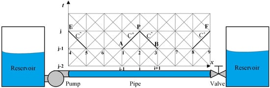 As shown in Figure 1, the MOC discretization method is applied as a numerical solution scheme using rectangular grids. In this way, the ordinary differential equation (ODE) transformation of the hydraulic transient model needs to constitute a grid system, where time and space derivatives are discretized along the vertical and horizontal axes. By dividing the pipe into uniform segments with a length of, the time step for the pressure wave to propagate in each segment is which is equal to. It is assumed in all simulation cases that the water flow originates from a reservoir with infinite volume, and the short draft tube between the pump and the reservoir is neglected in the analysis.