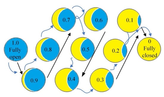 As can be seen in Figure 2, in a fixed total amount of valve closing time, the starting location is the place at which the valve opening is equal to 1.0, after valve operations, the finishing location is the full closure point, with an opening value equal to 0. In this problem, traditional valve motion (black line) can be seen as a linear visiting arrangement, which means an equivalent amount of time is spent during the sequential valve motion. This study preliminarily proposes nonlinear valve opening procedures (blue line). Different traveling times are assigned to different valve opening locations, and the visiting sequence is no longer required to maintain the same direction all the time. Then, the problem becomes a search for a time interval arrangement during valve closure that is able to minimize the pressure surge in the hydraulic pipe system. It is noted that the 10 valve opening points were selected in this study in order to present a preliminary demonstration; more or fewer intermediate points can be selected, depending on different amounts of available computational power.