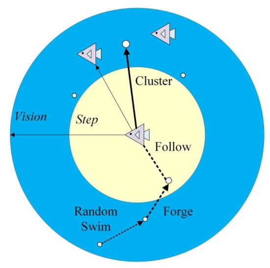 Figure 3 shows the optimization process using artificial fish. Each fish X simulates ecological fish behavior when carrying variable amounts of information and swimming towards optimized value iterations, such as a fish’s instinctive response to the local environment. When the artificial fish finds a position with better food density within its field of vision, it moves in that direction by a certain step. During repeated searching, moving and comparing new locations with the current food density state and crowdedness threshold, one member of the swarm will finally arrive at the best position, thus optimizing the target function. The two conceptual parameters mentioned, vision and step, determine the movement behavior of the artificial fish in the search for an acceptable result.