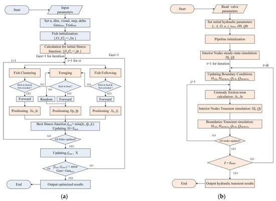 The calculation flow chart for the surge damping optimization. (a) Optimization procedures using ASFA; (b) Hydraulic transient calculation procedures.