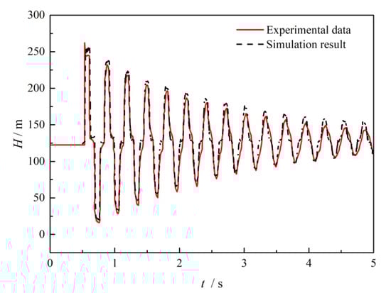 A classical reservoir–pipe–valve system is first used to validate the unsteady hydraulic model used in this study. The simulation settings were set in accordance with the experiment described in Ref. []. The configuration is similar to that described in the schematic diagram in this study, except that the pump device has been removed. Along the pipeline, the number of grid nodes is set to 100, so that the grid space and step time satisfy the Courant–Friedrichs–Lewy condition with adequate precision.
