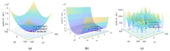 In Figure 6c, Schwefel’s optimization problem was selected. It is known that this multimodal function is a typical deception problem, where the global minimum value 0 is hidden in a valley at (420.97, 420.97), far from other local optimal valleys. Hence, it is difficult for the algorithm to jump out of local optimal points, which it easily falls into. When testing the transformed function, the optimization results showed the successful location of the valley compared with the theoretical values, validating the performance of the proposed ASFA as well as its feasibility for optimizing the nonlinear problems in this study.