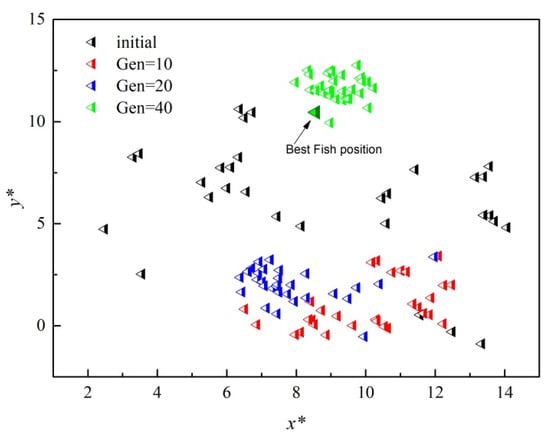 To visualize the optimization process, Figure 7 and Figure 8 serve as an example in this work, which is similar in other cases. It can be seen in Figure 7 that the initial 30 artificial fish in black triangles representing the valve opening sequences are initialized in random positions. After the implementation of the ASFA optimization process, the fish start to cluster and follow the optimal fish at the time, escaping from local optimum positions by foraging throughout the search space. At the 40th generation of the swarm of fish, the leading fish depicted with green triangles emerge at the best position, and the searching process is then terminated.