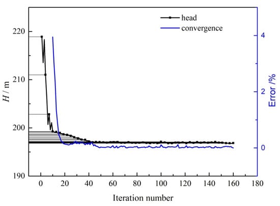 Figure 8 shows the variation in the fitness function and convergence curve with increasing numbers of iterations. The black line represents the fitness function as the optimal pressure head value, while the blue line represents the convergence curve. It can be seen that the optimal head value fluctuates during the initial clustering swarm at around five iteration steps, and soon the head value quickly decreases with the rapidly decreasing convergence curve. After 10 iterations, the minimization of the optimized head value tends to slow down, and it almost remains unchanged after 40 iterations, while the convergence curve decreases to an extremely low level.