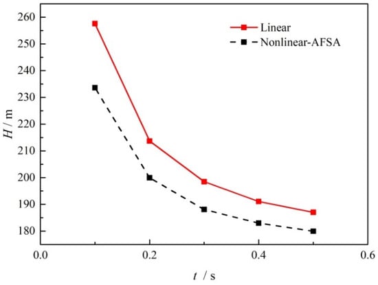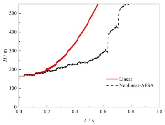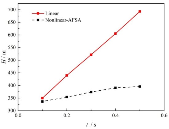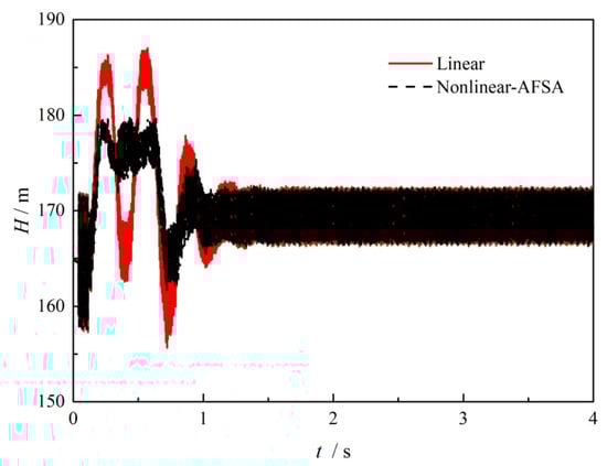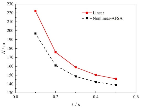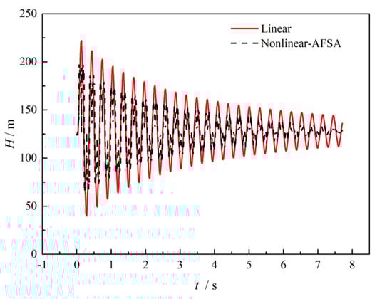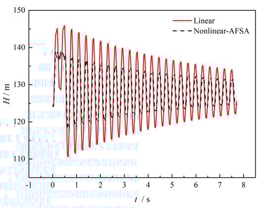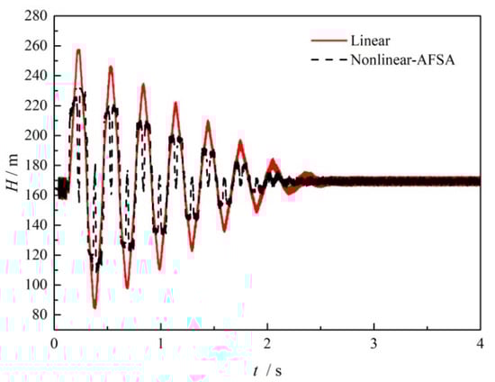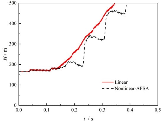 On the basis of the obtained optimized valve closure time arrangement, Figure 9 compares the transient pressure head at the midpoint of the pipe when the valve is closed within a time of 0.1 s. As can be seen from this figure, the solid red line is the result when performing linear valve closure, while the dashed black line is the results when using the optimized nonlinear valve closure. Compared to the shark waveform observed for linear closure, the wave peaks are split into double peaks, and the amplitude is obviously reduced, along with the wave valley, for the same lengths of valve closing time. The results suggest that with the optimized valve operation, the hydraulic pressure fluctuation can be damped in both directions without changing the wave frequency. The safety risk can then be reduced by avoiding larger over pressure and negative pressure.