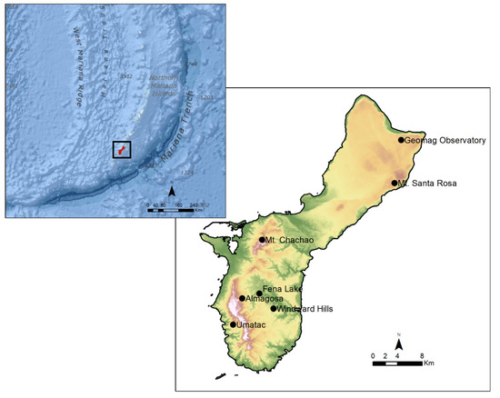 - Lander, M.A.; Guard, C.P. Creation of a 50-Year Rainfall Database, Annual Rainfall Climatology, and Annual Rainfall Distribution Map for Guam; Technical Report #102; Water and Environmental Research Institute of the Western Pacific of the University of Guam: Mangilao, Guam, 2003; p. 32. [Google Scholar]