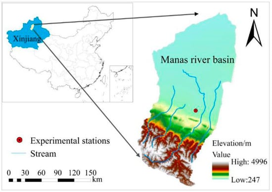 A field experiment was conducted over two crop growth periods from 2018 to 2019 in the Key Laboratory of Modern Water-Saving Irrigation (85°57′49″ E, 44°19′28″ N), Shihezi, Xinjiang Province, Northwest China (Figure 1). The test station is located in the western suburbs of Shihezi, with an elevation of 452 m and an average slope of 5.6‰. The region has a temperate continental climate, with an annual average sunshine time of about 2868 h. The accumulated temperature above 10 °C is 3472.3 °C, and the accumulated temperature above 15 °C is 2958.4 °C. The average annual rainfall is 209 mm, and the average annual evaporation is 1658 mm. The soil conditions of each soil layer in the test station are shown in Table 1. The meteorological data of the experimental area during the cotton growth periods are shown in Figure 2.