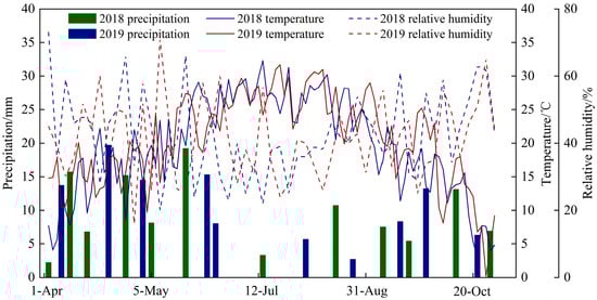 Daily meteorological variation during cotton growth periods (1 April to 30 October) in 2018 and 2019.