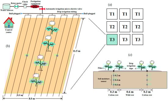 Depiction of the filed experimental design: (a) the experimental plot distribution under three irrigation methods (T1, T2, and T3), with three replicates; (b) a diagram of the T3 treatment, showing the system and its size; (c) a profile view of the cultivation pattern of the drip-irrigated cotton used in this study, with sensor locations depicted.