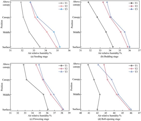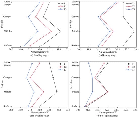 As shown in Figure 4, the differences in air temperature at different growth stages and different locations were significant (p < 0.05). Throughout the whole growth period, the air temperature at different locations was T1 > T2 > T3. Compared with T1, the air temperature in the lower, middle, canopy, and 10 cm above the of T2 and T3 decreased by 0.25, 0.3, 0.25, and 0.57 °C; and 0.84, 0.89, 0.37, and 0.77 °C, respectively. Within the growth period, the air temperature of each treatment showed the following trend: budding stage > seedling stage > flowering stage > boll-opening stage. The air temperature at different locations of each treatment showed the law of being high in the middle and low on both sides, which may have been due to the concentration of leaves in the middle, poor permeability, and relatively blocked heat exchange.