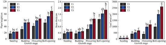 Throughout the growth period, the plant height, stem thickness, and leaf area of T1 were at the lowest levels, and the growth with this treatment was the worst. Compared with T1, the plant heights of T2 and T3 were 30.51% and 35.59% higher at the seedling stage, 65.52% and 68.96% higher at the budding stage, 42.62% and 56.90% higher at the flowering stage, and 39.20% and 71.21% higher at the boll-opening stage, respectively. During the boll-opening stage, the plant height of T2 and T3 began to show significant differences. This shows that the irrigation threshold set by T3 is more sensitive and frequent, allowing the soil moisture content to be maintained within a reasonable range. Throughout the whole growth period, the stem thickness of T2 and T3 was significantly different from that of T1, while there were no significant differences between T2 and T3. Compared with T1, the stem thickness of T2 and T3 was 25.00% and 30.56% higher at the seedling stage, 30.56% and 38.29% higher at the budding stage, 44.62% and 84.61% higher at the flowering stage, and 28.12% and 46.88% higher at the boll-opening stage, respectively. It can be seen from Figure 6 that the leaf area of T1, T2, and T3 had no meaningful differences at the seedling stage. After the budding stage, the leaf area of T2 and T3 was significantly higher than that of the T1 treatment, and the difference was significant. Compared with T1, the leaf area of T2 and T3 was 23.85% and 61.28% higher at the budding stage, 144.16% and 191.35% higher at the flowering stage, and 101.94% and 162.91% higher at the boll-opening stage, respectively. T3 used real-time monitoring of soil moisture to determine irrigation, so the cotton root system maintained a suitable state of soil moisture, which ensured the safe growth of the cotton.