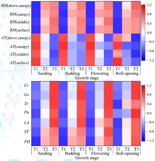 The physiological growth and development of plants and the microclimate characteristics of the farmland throughout the whole growth period of each treatment were standardized, and the heat change map was constructed. From the heat map, the differences between each treatment could be seen more intuitively. It can be observed in Figure 7 that according to the chromatographic stratification standard, the overall effect of the T3 treatment is significantly better than that of T2 and T1 in the two indicators of crop relative humidity and air temperature. In other words, the T3 treatment maintained a lower temperature and higher relative humidity throughout the whole growth period, compared with T2 and T1. This is more conducive to cotton growth. In terms of physiological growth indices of crops, the indices of the T3 treatment were significantly better than those of the T2 and T1 treatments, and the indices of the T2 treatment were also better than those of T1. As a whole, the T3 treatment was preferable to the other two treatments for regulating the farmland microclimate and promoting cotton growth and development.