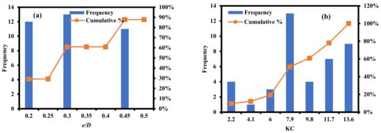 where π5, π10, and π11 are the Keulegan–Carpenter (KC) number and the Reynolds number of the pipeline due to regular wave (ReW) and current (ReC), respectively. On the basis of Cheng et al.’s [1] research, many π-variables in Equation (2) need to be combined and categorized as follows: