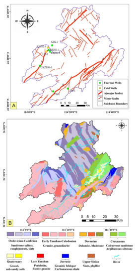 Simplified structural map (A) and geological map (B) of the study area showing thermal and cold well sites, major and minor faults indicating deformation.