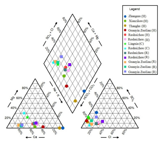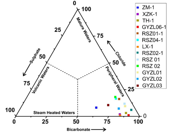 H and O isotopes for geothermal and cold water samples are plotted in Figure 4. It is quite clear from the graph that no such deviation was observed from the two standard representative lines. The position of all the water samples close to the global meteoric water line (GMWL) [51] and local meteoric water line (LMWL) of Jiangxi province [52], with no deviation observed [53], undoubtedly confirmed their meteoric type of origin. Another piece of evidence in support of the meteoric origin is that the concentration of environmental isotopes in the case of oceanic origin is around 0% (VSMOW), salinity ranges from 33,500 ppm to 37,600 ppm, and chloride is about 19,300 ppm [54]. The placement of all the water samples in a triangular plot shows only one dominant water type and that is HCO3− with a low concentration of chlorine (Figure 8). The analysis of the point position comparison among water samples confirms the interference of peripheral water characteristics and it increased up to a considerable level during the process of heat storage to the seepage of the upsurge of underground hot water and it is thus speculated that the mixing effect is enhanced.