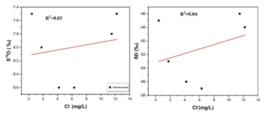 Cl− is an important tool for assessing the mixing of geothermal water with cold groundwater in upflow zones of geothermal water systems. The correlation of δD and δ18O with Cl− is insignificant confirming the mixing of geothermal waters with shallow cold waters [33,34], as shown in Figure 5. If the steam separation/evaporation process was dominant, then Cl− enrichment would have been observed, but in the present study, low Cl− contents minimized this possibility and supports the mixing process [35,36].