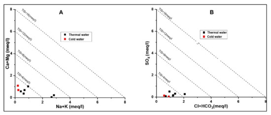 The TIS salinity plot is also an important index used for the classification of hydrochemistry where the (Figure 6A) Ca + Mg vs. Na + K diagram shows the low salinity with minimum variations. Usually the high Ca and Mg concentrations are likely due to re-equilibration or mixing with Ca and Mg rich cold waters during infiltration of thermal waters [37]. Furthermore, SO4 vs. Cl + HCO3 in the TIS salinity plot shows that the thermal and cold waters accounted for low salinity content (Figure 6B).