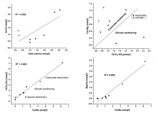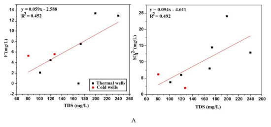 The correlation of various parameters is shown in (Figure 7A–C). Na+ exhibits a good linear correlation with R2 = 0.746 when plotted against TDS. The little elevation in SO42− might reflect the oxidation of hydrogen sulfide (H2S) or other sulfide minerals involved in the formation of ore deposits and shows an agreeable correlation with TDS. Even though the continuing dissolution of gypsum and anhydrite as well as the interaction with evaporite deposits also leads to a possibility of elevated sulfate content [38], simultaneously oxygen concentration should be increased by the shallow water table to promote the sulfide oxidation and hence the SO42− concentration would be increased [39]. All the water samples are dominated by HCO3− ions and show higher pH > 6 rather than CO3 ions that affect the pH of water. Because at low pH< 6 the carbonates occur mainly in the form of weak H2CO3 caused by the degassing of CO2 [34] and it can also reduce the pH of natural waters [40]. The HCO3− content of the cold water (RSZ02-1) and few thermal waters indicate the dilution by the HCO3− content of shallow groundwater during upward flow. Nevertheless, the HCO3− ion shows a good linear correlation with TDS.