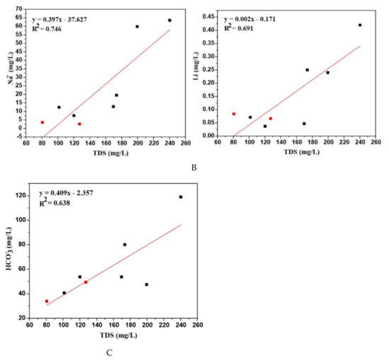 Extent of correlation between TDS and other hydrochemical parameters (A) F−, SO42−; (B) Na+, Li; (C) HCO3−) of thermal and cold ground waters of Suichuan County. Red and black points show the cold and thermal well samples.