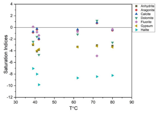 The SIs of most of the minerals yield negative results (less than 0), implying unsaturation of thermal and cold well samples regarding the minerals mentioned in Table 4. Overall, few exceptions were observed in the case of RSZ04-1, showing saturation to near oversaturation of aragonite and calcite minerals while dolomite shows an oversaturation state as well. In the same way, XZK-1 exhibits the saturation of fluorite mineral.