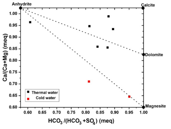Generally, the low concentrations of hydrochemical parameters show that water-rock interaction is not intense [31]. The considerable spatial inconsistency in EC and TDS concentrations proposed that groundwater chemistry was not homogeneous and was controlled by different processes [32]. The isotopic and hydrochemical composition of groundwater during their ascent to the ground surface may have been altered because of the steam separation caused by adiabatic expansion and dilution by mixing with shallow groundwater [12]. As described earlier in Figure 3, the dominant water type is HCO3-Ca-Na. Due to the variability in hydrochemistry, however, the Na-HCO3-SO4 type can be seen exhibiting approximately 32% SO4. RSZ04-1 belongs to the Na-Ca-HCO3-Cl type. Coldwater sample RSZ02-1 belongs to the Ca-Mg-HCO3 type containing Mg content up to 25%.