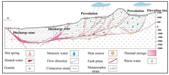 The process continues until the groundwater encounters a barrier that hinders its downward migration and it starts flowing along the stratum interface or cross fissures. This cycle continues and, hence, groundwater attains the heat from surrounding rock heating, and the friction among faults and fractures is also a source of heat. However, the major heat source in the region is radioactive granite [74,75]. This is accelerated due to the increasing pressure and resulted in the fluid being discharged from the permeable fractures into the surrounding rocks [76]. Therefore, thermal groundwater dissolving various chemical elements migrated upward from the areas such as tensional structures and zones of high permeability [77,78,79,80], oozing out as hot springs. Based on this mechanism and the hydrochemical results of thermal groundwater, the genetic model in Suichuan has been put forward.