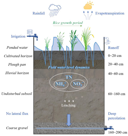 Rice (Oryza sativa L.) is one of the main cereal crops in the world, feeding about half of the global population [1]. In China, rice accounts for 35% of cereal production [2], which alone consumes about 50% of the freshwater resources [3] and more than 11 million tons of nitrogen (N) fertilizers [4]. To ensure the high and stable yield of rice, the traditional continuous flooding irrigation method with a large dose of N-fertilizer was adopted in most regions. It consumed 50~300 cm of field water input during rice growth [5]. However, due to urban expansion, population growth and increasing extreme climate events, the security of agricultural water supply is under threat, which has brought challenges to the sustainable development of irrigated agriculture [6,7]. Moreover, excessive application of N fertilizer and improper water management causes excessive losses of water and nutrients from runoff and deep percolation (DP) in rice paddies [8,9], which has drawn attention to ecological and environmental problems such as soil acidification and accelerated eutrophication of lakes [10,11,12].