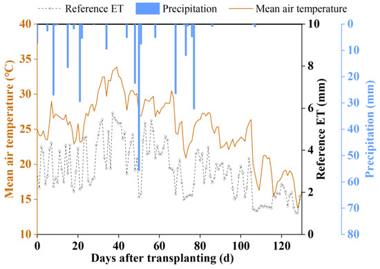Variation of daily average air temperature, reference evapotranspiration and precipitation during the experiment in Jiangning, China. The reference ET refers to the reference crop evapotranspiration, which was calculated from the meteorological data of the experimental site.