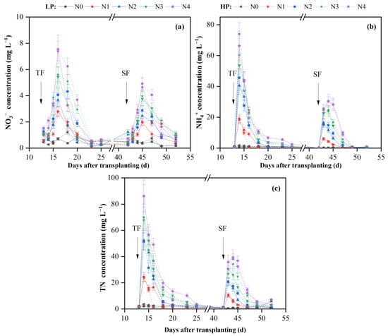 Variations of nitrate-N (NO3−-N, (a)), ammonium-N (NH4+-N, (b)) and total nitrogen (TN, (c)) concentrations in ponded water collected from different water and N treatments. The arrows denote the application of tillering (TF) and spikelet-developing fertilizer (SF), respectively. The application time of all treatments is the same. LP and HP, i.e., low percolation and high percolation, represent two deep percolation rates controlled by the lysimeters, 3 mm d−1 and 5 mm d−1, respectively. N0~N4 represent 0, 60, 135, 210 and 285 kg N ha−1 application, respectively.