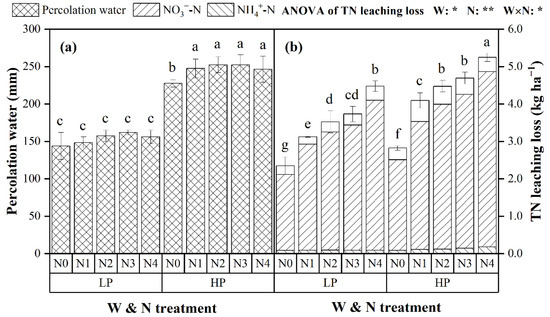 Percolation water (a) and total nitrogen (TN, (b)) leaching loss under various water and N treatments. Different letters next to means denote significant differences based on Least Significant Difference test (LSD test, p < 0.05). * and ** denote significant at 0.05 and 0.01 levels, respectively, while ns is non-significant (p > 0.05). LP and HP, i.e., low percolation and high percolation, represent two deep percolation rates controlled by the lysimeters, 3 mm d−1 and 5 mm d−1, respectively. N0~N4 represent 0, 60, 135, 210 and 285 kg N ha−1 application with straw returning, respectively.