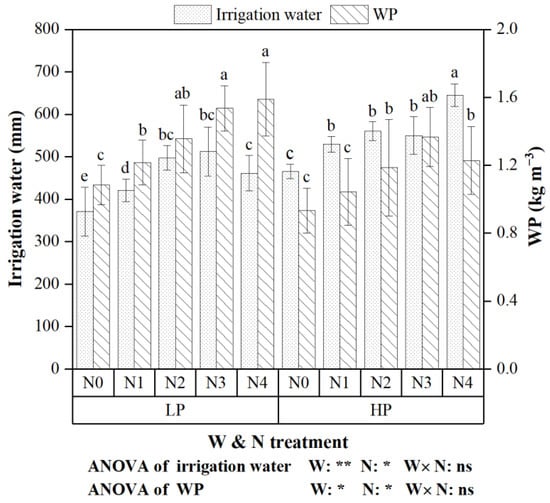 Irrigation water and total water productivity (WP) under various water and N treatments. Different letters next to means denote significant differences based on Least Significant Difference test (LSD test, p < 0.05). * and ** denote significant at 0.05 and 0.01 levels, respectively, while ns is non-significant (p > 0.05). LP and HP, i.e., low percolation and high percolation, represent two deep percolation rates controlled by the lysimeters, 3 mm d−1 and 5 mm d−1, respectively. N0~N4 represent 0, 60, 135, 210 and 285 kg N ha−1 application, respectively.