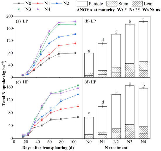 The dynamics of total N accumulation in the above-ground organs of each treatment is shown in Figure 6a,c. The total N uptake increased with days after transplanting. The significant difference in total N accumulation between different N fertilizer application treatments was detected from the fourth sampling date (after the jointing period) under both LP and HP regimes. The N uptake of N3 and N4 was significantly greater than that of N0, N1 and N2 from the 24th day after transplanting at LP, whereas it began on the 35th day after transplanting at HP. Moreover, no significant differences were observed in the total N accumulation of N3 and N4 until the sixth sampling date (after the milky ripening period) at HP. From heading to the yellow ripen, N3 increased rice N uptake under the LP and HP regimes by 22.4% and 17.9%, respectively, while with the N4 level, it increased by 20.5% and 12.1% respectively. At maturity, the total N accumulation of N4 treatment in LP and N3 treatment in HP was the highest, 174.0 and 164.6 kg ha−1, respectively (Figure 6b,d). When the N application level ranged from N0 to N3, the N uptake was significantly increased. It was observed that the total N accumulation of N4 treatment in HP was significantly lower than that of the N3 rate in HP. In addition, the total N accumulation in the panicles accounted for the largest proportion of total N accumulation in above-ground organs under the LP and HP regimes, ranging 71.2~81.0% and 73.4~81.2%, respectively, which decreased with increasing N level. According to the ANOVA at maturity, the effects of water and N were significant on N uptake, but the effect of W × N showed no significance.