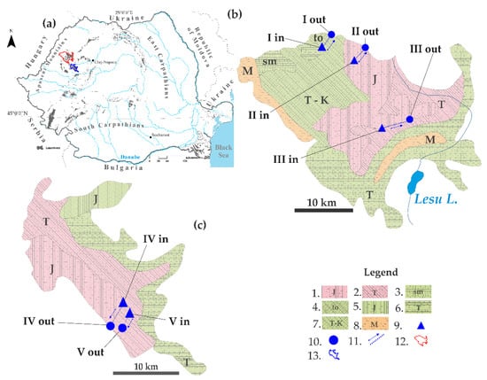Location of the two mountain ranges (Pădurea Craiului and Bihor Mountains) marked with red and blue delineations, respectively, in NW Romania (a). The five HKS (I to V) are depicted in panels (b,c), with the location of the ponors (triangles), springs (circles) and the direction of the water flow (blue arrows) through the different types of rocks explained in the legend (1. Limestones. 2. Limestones and dolomites. 3. Limestones, sandstones and conglomerates. 4. Calcareous sandstones and limestones. 5. Sandstones, conglomerates and limestones. 6. Limestones and sandstones. 7. Limestones, dolomites, sandstones and conglomerates. 8. Crystalline schists.).