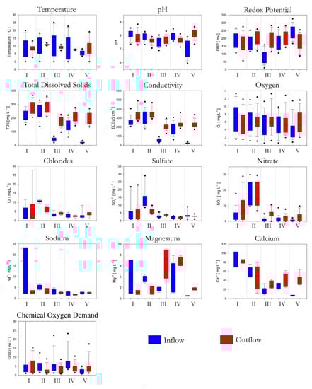 The nitrate concentration (Figure 2) in downstream samples (7.02 ± 7.43 mg/L) was significantly higher (t = −4.209, p < 0.001) compared to the nitrate concentration in samples collected from locations upstream in the selected hydrokarst systems (4.87 ± 7.42 mg/L). On the contrary, the organic matter (Figure 2), estimated here as chemical oxygen demand (COD), was lower downstream for all but site V. The concentration values for chlorides remained relatively unchanged (t = 0.42, p = 0.677) over the subterranean course of water through the five prospected HKS (Figure 2). The mean chlorides concentration was 5.55 ± 3.56 mg/L in upstream samples and 5.19 ± 4.62 mg/L in samples collected from downstream locations. A slight decrease in sulfates concentration (Figure 2) was noted between upstream (6.41 ± 6.37 mg/L) and downstream (4.89 ± 3.95 mg/L) locations. Sodium concentration (Figure 2) decreased (t = 2.226, p = 0.037) from upstream (3.136 ± 1.416 mg/L) to downstream (2.574 ± 0.864 mg/L) locations.