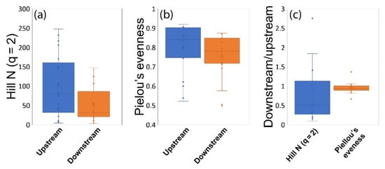 Box plots showing (a) Hill N (q = 2) (effective species numbers) as a measure of upstream and downstream alpha diversity; (b) upstream and downstream Piellou’s evenness; and (c) the site and time specific downstream/upstream ratio between the measures in panels (a,b). A value lower than 1 represents a decrease in the downstream sample.