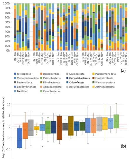 (a) Proportion of the different phyla present in samples collected upstream (IN) and downstream (OUT) for the five (I–V) investigated hydrokarst systems. (b) Box plots showing the distribution of the ratios between downstream and upstream locations on a Log2 scale. The ratios were calculated per site per time point. Red lines mark +1 and −1, representing a 2-fold increase or decrease, respectively.