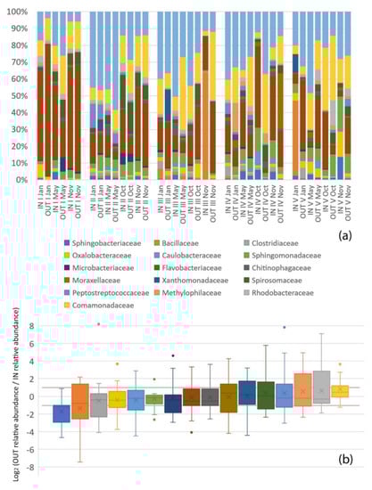 To evaluate whether significant changes in the relative abundance of bacteria could be observed at a higher taxonomic resolution, we conducted a similar analysis at the family level (Figure 5). Out of 16 families with an average relative abundance above 1%, 3 showed significant changes between upstream and downstream samples: Comamonadaceae (p = 0.0018), Clostridiaceae (p = 0.04), and Sphingobacteriaceae (p = 0.000).