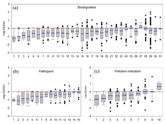 Log ratios of the different taxa (relative abundance > 1%) for which a significant change (p < 0.05) in relative abundance was detected between upstream and downstream locations across all sampling sites and periods. Values above and below 0 indicate a higher abundance downstream and upstream, respectively. The box plots correspond to taxa in Table 2, with matching numbers for the biodegraders (a), pathogenic bacteria (b) and pollution indicators (c).