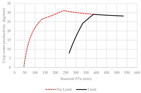 When no limit on deficits is enforced, it is optimal to practice deficit irrigation in one crop growth stage. Consequently, the last part of the CWPF above an of 240 mm is characterized by deficits (292 mm) in only one crop growth stage. Applying a maximum limit of 50% on deficits limits the amount of the deficit to 146 mm, before combining the deficits with deficits in other crop growth stages. Combining deficits in more than one crop growth stage causes crop yield to decrease more than proportionally. Overall, the limit of 50% deficit causes deficits in different crop growth stages to be combined more quickly, and therefore crop yield decreases more with increasing levels of seasonal deficits. The limit furthermore requires that the crop evapotranspires at least 267 mm of water to realize a crop yield. Enforcing a limit on the level of deficits has some serious implications for maximizing CWP.
