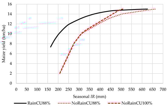 Figure 7 shows that when the irrigation system is assumed to apply water 100% uniformly and rainfall is not accounted for, the maize WPF mimics the shape of the CWPF for the same scenario. Interestingly, the amount of water applied is constantly less than