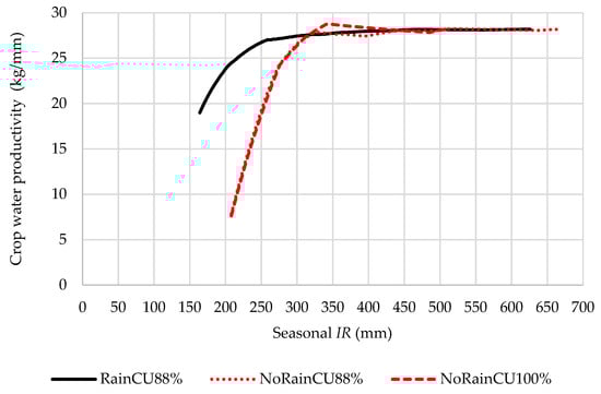 Figure 9 show that CWP is, to a great extent, unaffected by applied irrigation water beyond applications of 317 mm irrespective of the scenario considered. For irrigation water applications greater than 440 mm, there is almost no difference between the scenarios, and the CWP of all the scenarios stabilizes around 28 kg/mm.