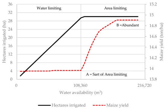 When water availability is reduced below point B, a rational decision maker will acknowledge the trade-off between increased profits from applying more water per hectare and the reduction in the total irrigated area necessary to allow higher application rates per hectare. For water availability between points A and B, it is profitable to reduce water applications per hectare with reduced crop yields while irrigating the total irrigation area. At some point, reducing water applications per hectare will become unprofitable and the only way to produce profitably is to reduce the area irrigated. Such a situation is depicted by water availabilities below point A where water is the most limiting production factor. The water-limiting case is characterized by a constant decrease in area irrigated to maintain profitable production levels per hectare.